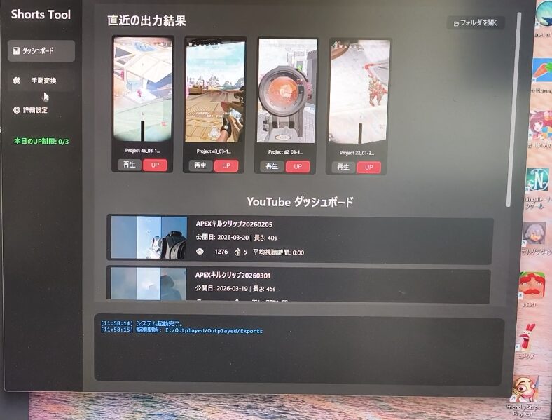 弟は、趣味でSNS用のFPSの良いシーンまとめ横長動画を作っている。 YouTubeShortsにも適していると思うため、既存の動画をShorts用に自動編集できるようにしたい。 完成... -